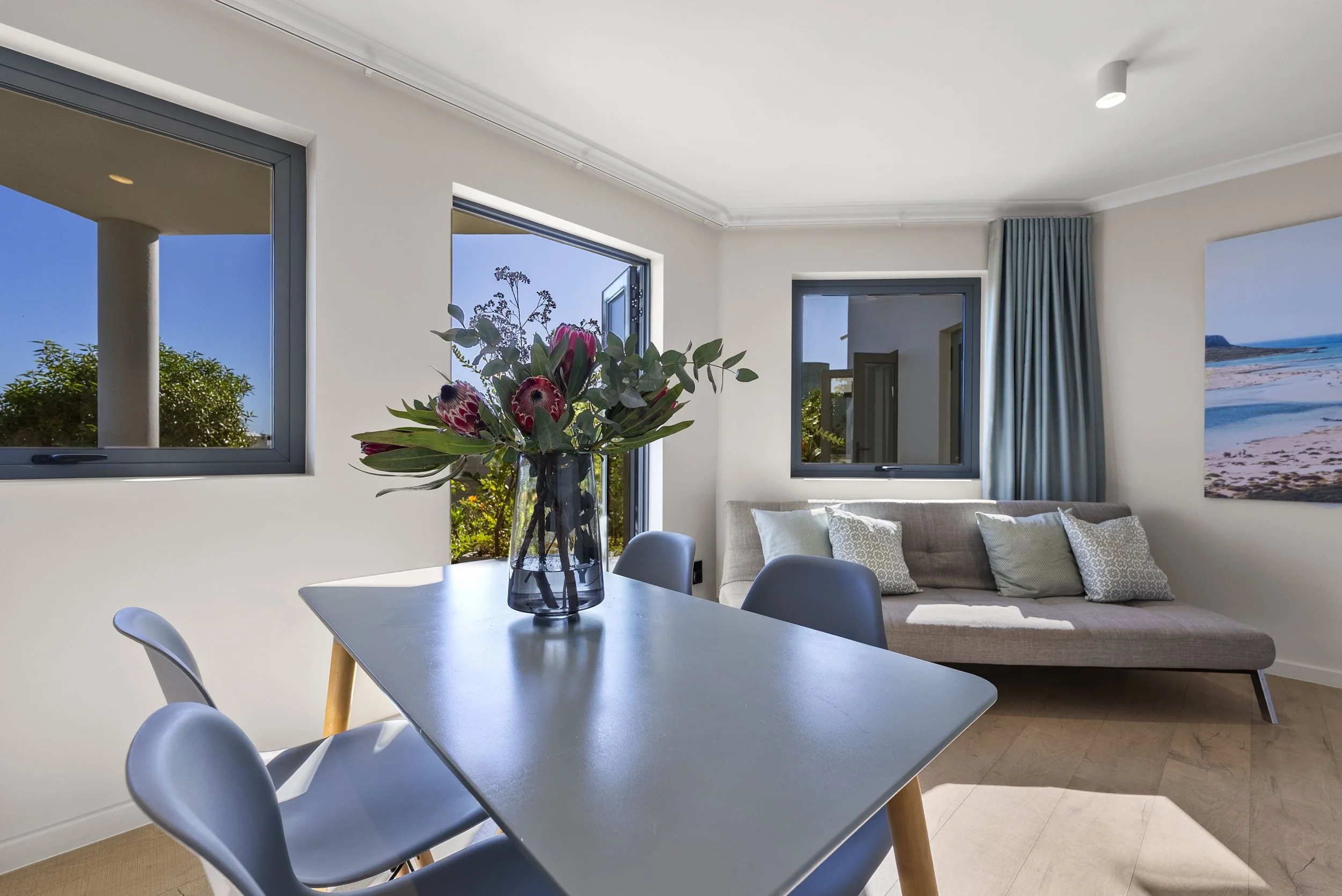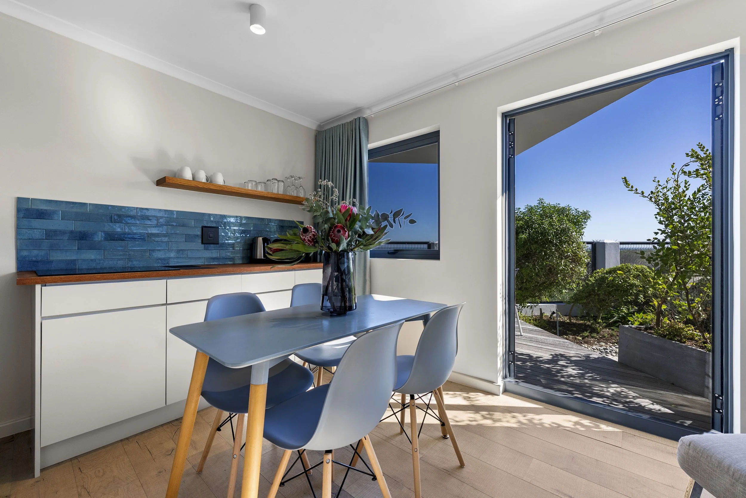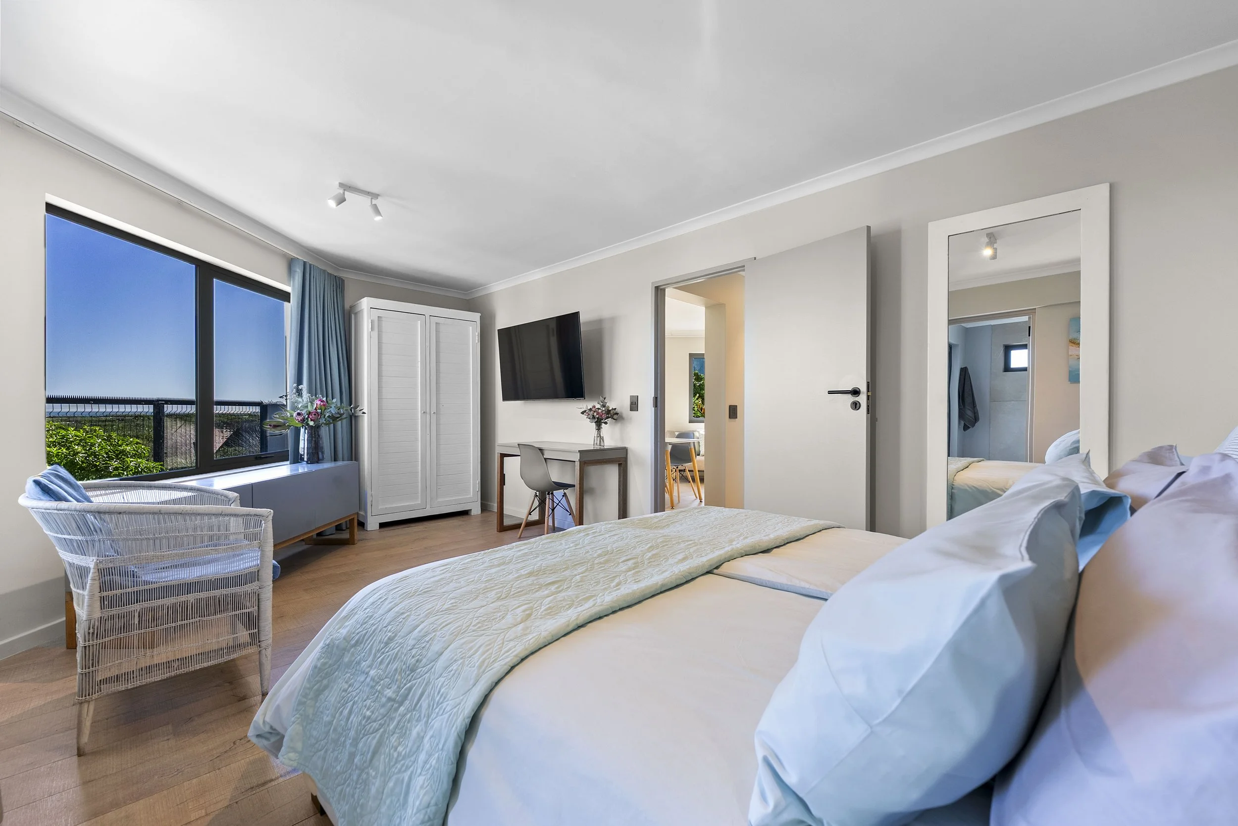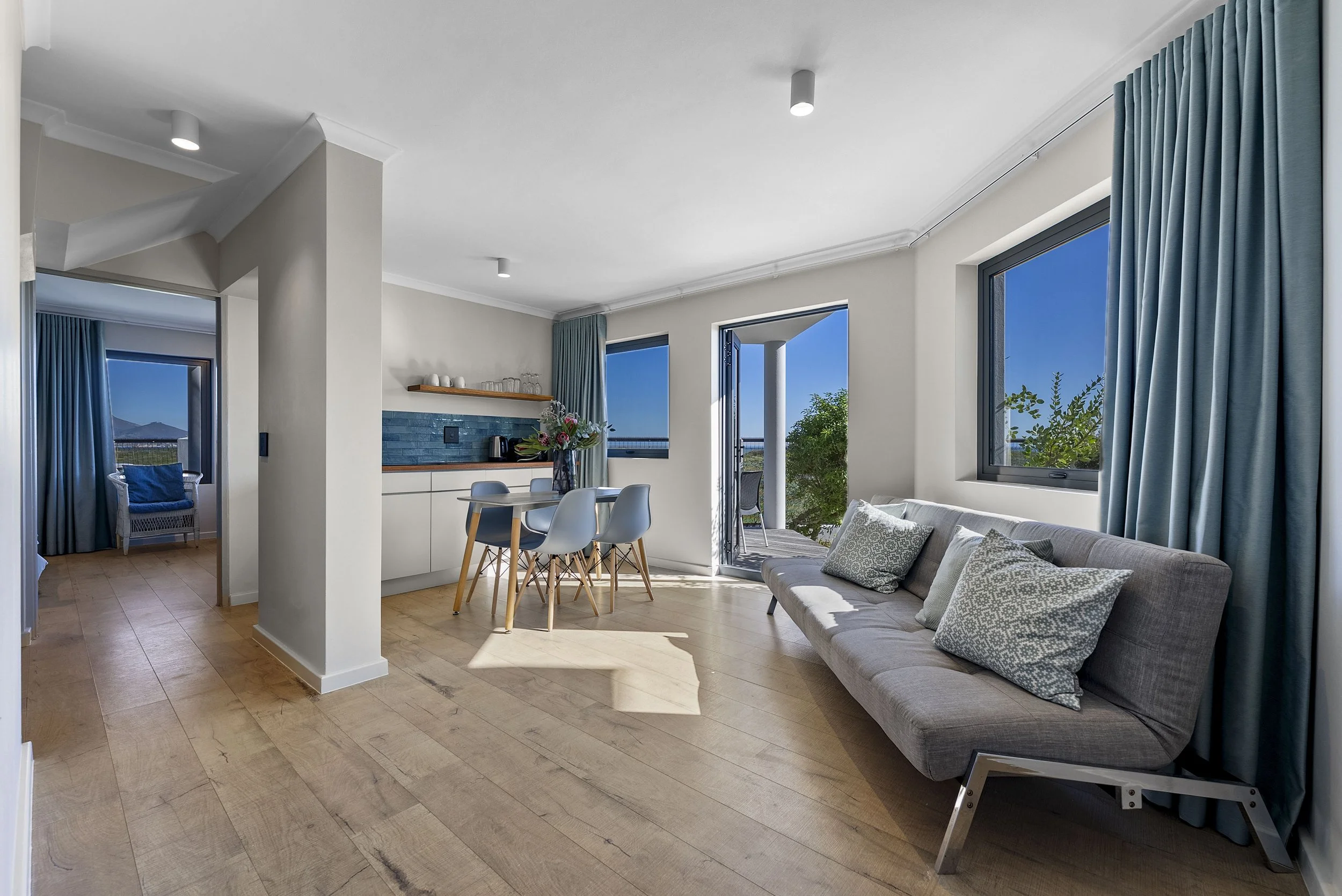 The apartment has two wooden decks with sea view, both facing the backyard. The bedroom is equipped with a king-size bed and en suite bathroom. The living room has a kitchenette and a sofa bed.