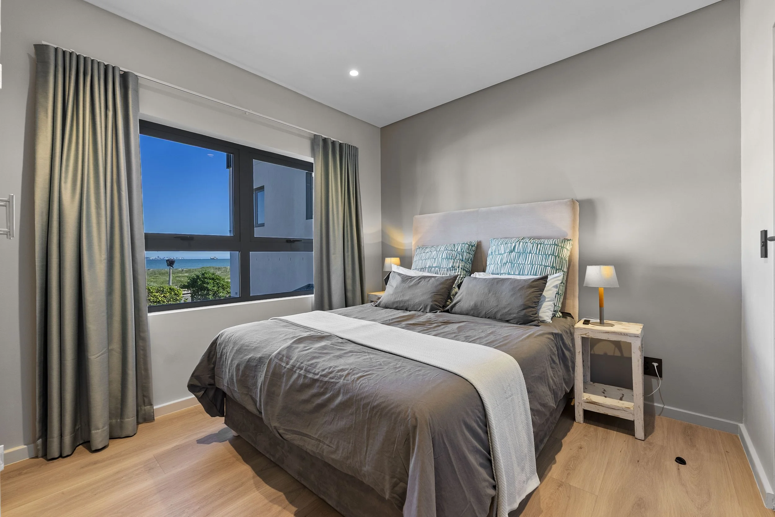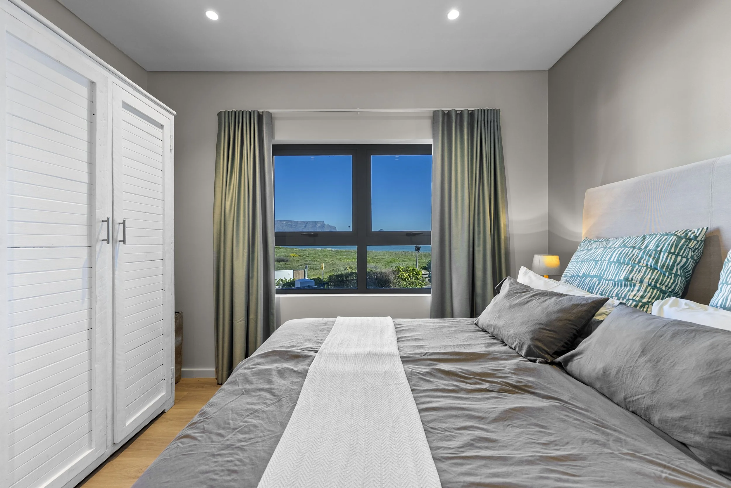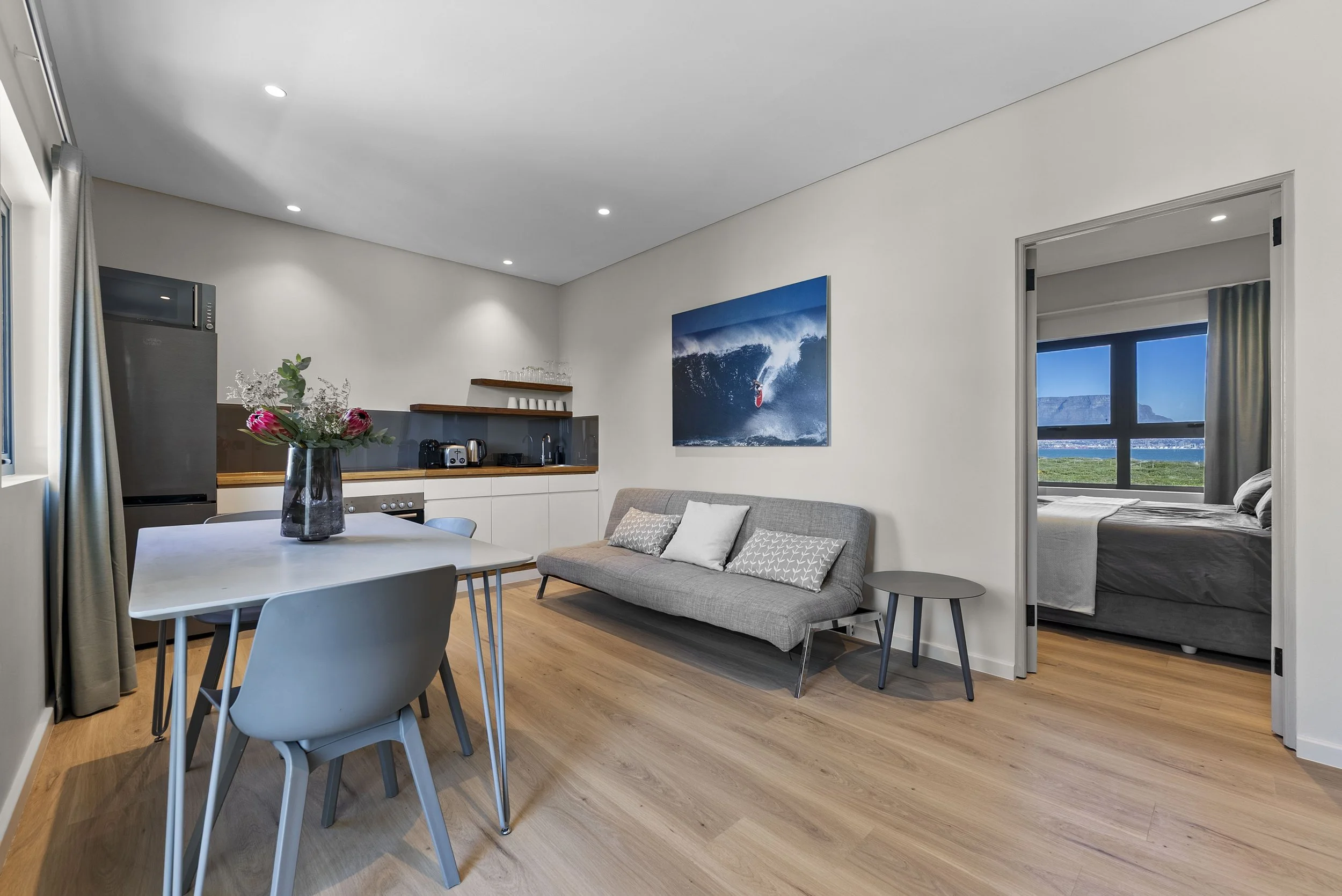 The apartment is located at the first floor. The terrace has a wooden deck and faces the garden and pool. The bedroom is equipped with a queen size bed and en-suite bathroom it has a view to the Table Mountain and the ocean. The living room has a kitchen unit and a sofa bed.